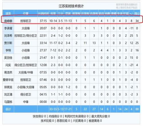 全场比赛,庞峥麟一共打了37分钟,投篮14中10,命中率达到了71.4%,其中,三分球5投3中,罚球13中11,砍下了34分6篮板4助攻1抢断!其中,34分也是继续刷新了他CBA职业生涯的得分 新高,在此前,他面对上海队的时候,砍下了32分。