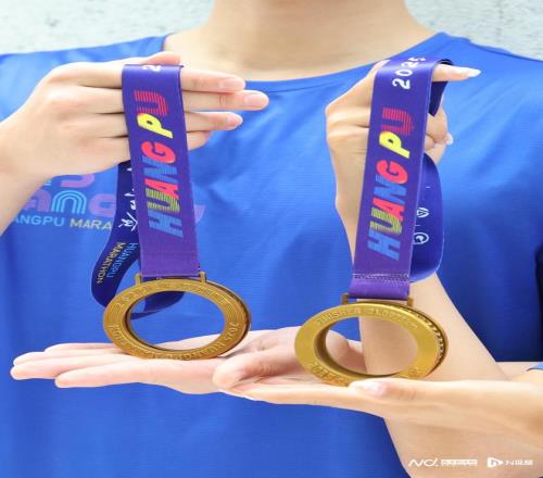 备受瞩目的完赛奖牌则化身为“可佩戴的城市微型博物馆”,其设计灵感源于精密齿轮轴承,致敬黄埔深厚的制造业根基。奖牌中央的圆环内圈镌刻的开拓者雕像、科学城地标、知识城九龙湖等图案,转动时交替显现,宛如一条缩微的“城市发展能量带”,隐喻着个人拼搏精神与城市前进动力的同频共振。