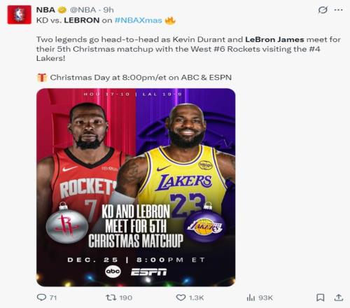 北京时间12月25日,NBA官方预热了年终大战,杜兰特与勒布朗这两位传奇巨星将第五次在年终大战中交手,前五次交手詹姆斯4胜1负占优。